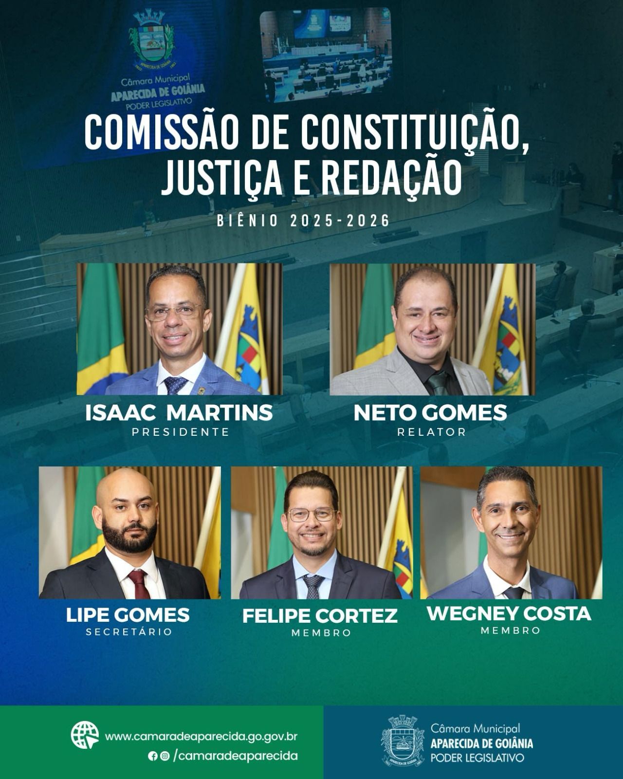 Câmara Municipal de Aparecida de Goiânia, 28/02/2025. A Câmara Municipal de Aparecida de Goiânia informa que a nova composição da Comissão de Constituição, Justiça e Redação (CCJ) foi definida pela presidência do vereador Gilsão Meu Povo, após diálogo com os demais parlamentares.