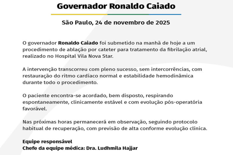 Ronaldo Caiado passa por procedimento cardíaco e tem quadro estável, dizem médicos
